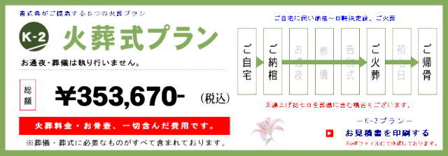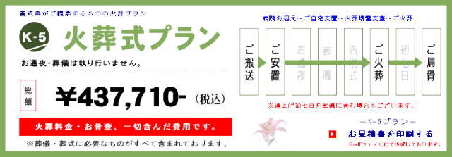 下記、5パターンの「火葬のみ費用」をご案内させていただきます。火葬迄の流れなどは当社スタッフが細部にわたりわかりやすくご説明をします。ご安心下さい。